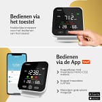 Op afstand af te lezen en in te stellen, te koppelen aan meerdere telefoons, meerdere ruimtes en meerdere van deze PiXXO co2 meters met diverse persoonlijke in-app-notificaties.
